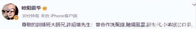 在许绍雄去世后,圈内很多知名艺人也也纷纷发文悼念。 欧阳振华: “尊敬的训练班大师兄,许绍雄先生,小弟受益良多,大师兄一路走好,永远怀念你。”